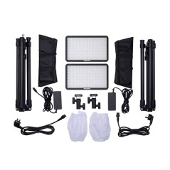 - Kompletny zestaw dwulampowy z niezbędnymi akcesoriami: 2x softboxy, siatki kontrolne światła, dyfuzory, adaptery amaran Ace Lock do statywów, zasilacze, kable, 2-metrowe składane statywy oświetleniowe oraz chroniąca torba transportowa