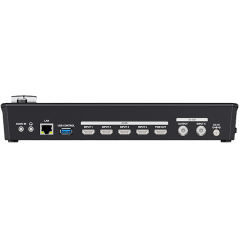 Urządzenie wyposażono w dwa gniazda audio 3,5 mm – jedno do podłączenia zewnętrznego źródła dźwięku, a drugie do odsłuchu na żywo. Dodatkowo mikser umożliwia sterowanie kamerami PTZ, w tym kontrolę obrotu, zoomu oraz ostrości.