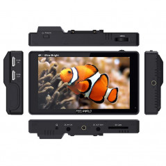 Szklany panel dotykowy ułatwia szybką obsługę za pomocą prostych gestów. Sterowanie dotykowe może zostać wyłączone za pomocą przycisku funkcyjnego na górze obudowy, odpowiadającego także za uruchamianie monitora. Układ przycisków na obudowie został maksymalnie uproszczony - poza wspomnianym przyciskiem funkcyjnym na górnej krawędzi znajduje się pokrętło, za pomocą którego można poruszać się po menu. Jego dłuższe naciśnięcie otwiera dostęp do kolejnych funkcji. Z lewej strony umieszczono porty HDMI - wejściowy i wyjściowy, dzięki którym monitor pozwala na jednoczesne wyświetlanie rejestrowanego obrazu oraz przekazywanie go dalej, do zewnętrznego ekranu czy projektora. Na dolnej krawędzi znajdują się z kolei gniazdo słuchawkowe stereo mini jack 3,5 mm, wejście DC 12 V oraz wyjście DC 8,4 V, służące do podłączenia akumulatorów typu Dummy Battery. W obudowie przewidziano także port na karty SD oraz dwa otwory montażowe w standardzie 1/4 cala - jeden na dolnej krawędzi i drugi, umieszczony z prawej strony. Dzięki temu monitor może być z łatwością zamontowany w rozmaitych uchwytach, klatkach operatorskich oraz rigach lub też korzystać z dołączonego do zestawu dedykowanego ramienia.