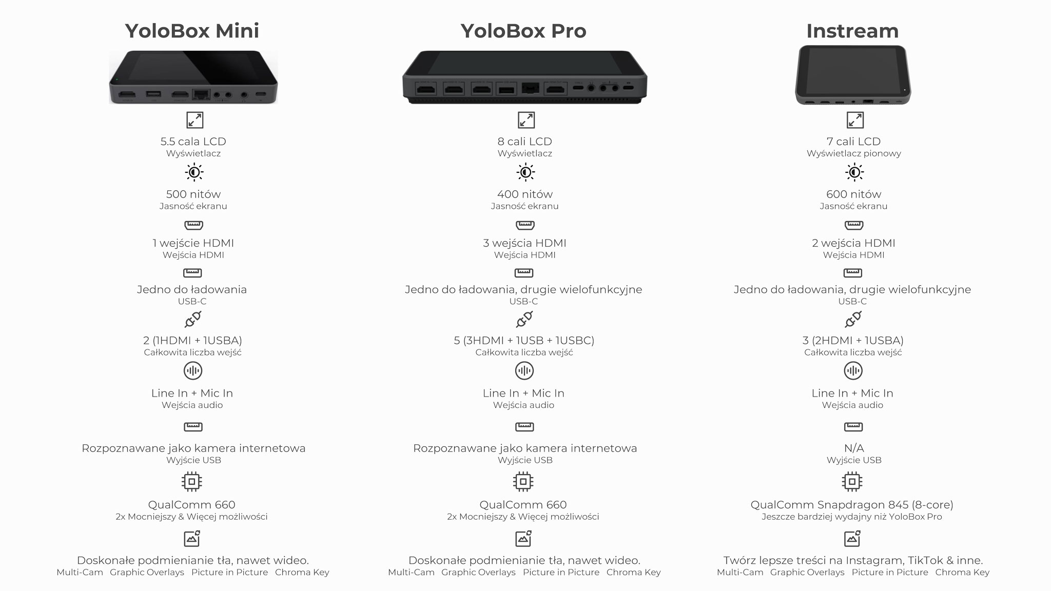 Urządzenie YoloBox Pro ma przekątną 8 cali i waży 750 g. Wyposażono je w trzy wejścia HDMI, jedno wyjście HDMI, jedno w pełni funkcjonalne złącze USB typu C, dzięki czemu możesz podłączyć do niego nawet osiem źródeł, z czego cztery mogą być fizycznymi aparatami lokalnymi. Dwa pozostałe to np. wstępnie nagrane filmy zapisane w pamięci wewnętrznej lub pochodzące z sieci. Urządzenie Pro obsługuje rozdzielczość wejściową na poziomie 720p i 1080i/p i przesyła sygnał strumieniowo w wybranej rozdzielczości (540p, 720p i 1080p60) przy użyciu kodeka H.264. Za pomocą wyjścia HDMI możesz wyświetlać swój stream lokalnie na urządzeniu obsługującym standard HDMI.