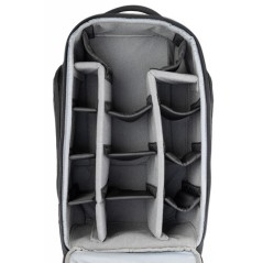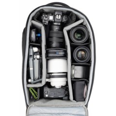 Plecak pomieści aparat DSLR lub bezlusterkowiec z uchwytem oraz obiektyw 200–400 mm f/4. Wewnątrz znajduje się także wyściełana kieszeń na laptopa do 16 cali. Regulowane, miękkie szelki i pas piersiowy zapewniają komfort noszenia przez cały dzień, a teleskopowa rączka i podwójne kółka pozwalają z łatwością poruszać się po lotniskach. Plecak spełnia większość standardów bagażu podręcznego.