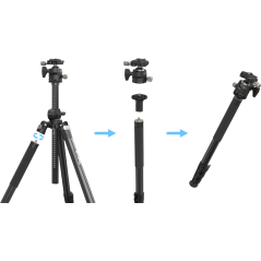 W prosty sposób można przekształcić statyw w statyw jednonożny – wystarczy odkręcić jedną z nóg i zamocować do niej dołączoną głowicę kulową. To idealne rozwiązanie w dynamicznych sytuacjach zdjęciowych, gdzie liczy się mobilność i szybka reakcja.